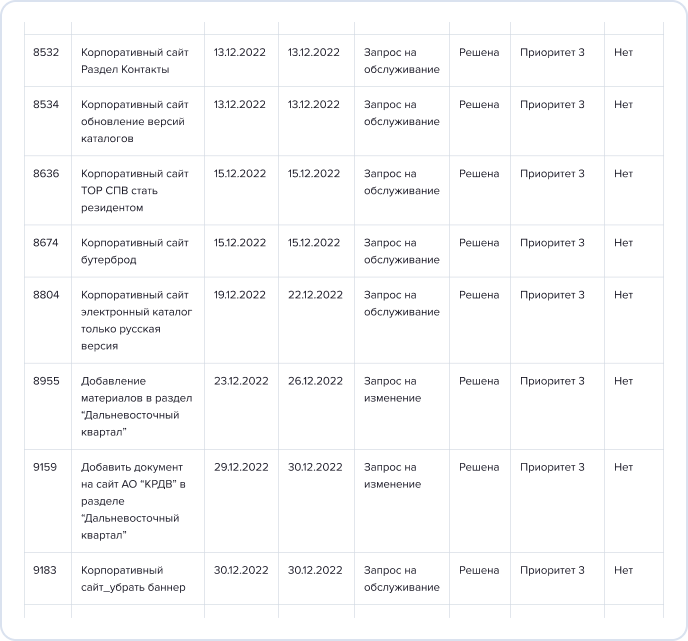 Было организовано несколько категорий запросов: Инцидент, Запрос на изменение и Запрос на обслуживание. По последнему типу мы организовали поддержку для сотрудников Заказчика по вопросам функционирования веб-сайта, личного кабинета, панели администрирования.